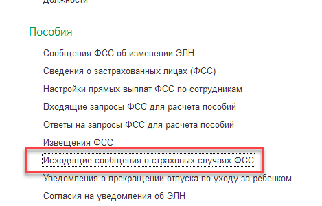 Так же этот документ доступен из журнала Кадры — Пособия — Исходящие сообщения о страховых случаях ФСС.
