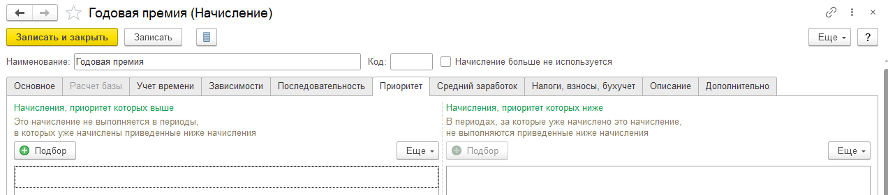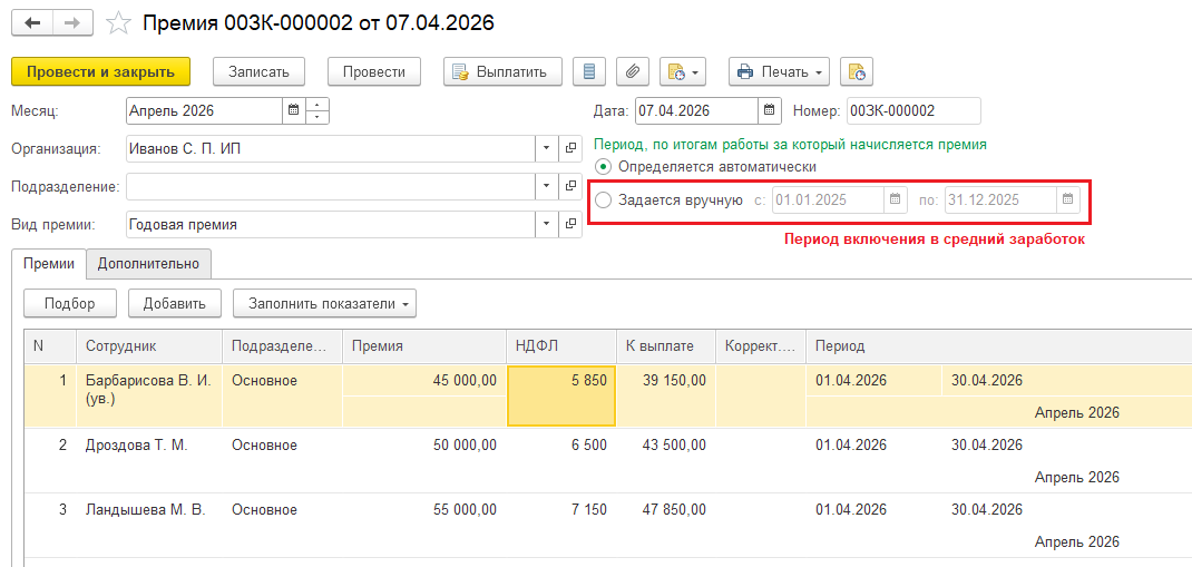 Пришлите, пожалуйста, скрины настроек годовой премии постранично. Какие флажки должны быть взведены, с кодами, с галками, статьями расходов? Еще как правильно заводить эту премию, если мы выплачиваем в Апреле 2026г. за 2025г (построчно периоды)?