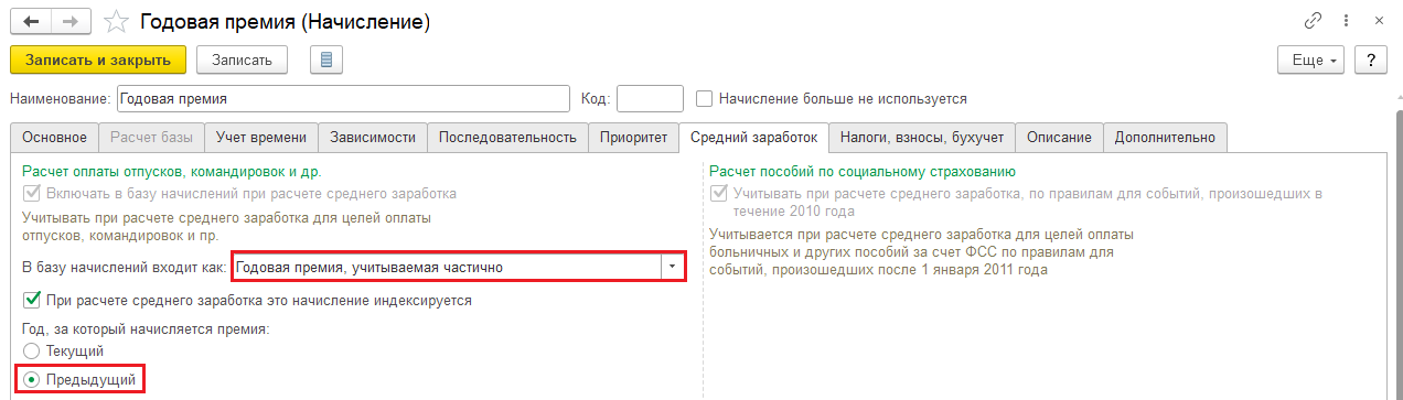 2. Годовая премия, полностью учитываемая — если рассчитывается пропорционально отработанному времени. Т.е. если в формуле начисления есть показатели времени ВремяВДнях, ВремяВчасах и т.д.