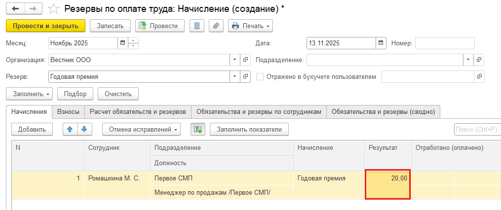Показатель, который Вы предложили, он у нас уже в ЗУПе присутствовал, я его поместила в резерв годового вознаграждения как показано в ролике, ничего не начислилось.