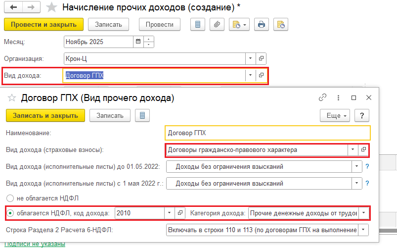Не совсем согласна. Я отсторнировала все разовые начисления за 10 месяцев. Сделала новый документ «Разовые начисления» Завела новое начисление Договор (работы, услуги ) Нерезидент с удержанием НДФЛ и Страховыми взносами. Заполнила по сотруднику , результат- полная сумма что было начислено и выплачено, сумма одинаковая) НДФЛ рассчитался . Период поставила с 01.10.2025-31.10.2025 .За ноябрь начислила через договор ГПХ. Начислила ЗП за ноябрь и все у меня встало.