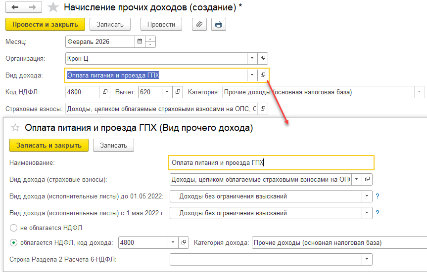 — в ЗУП с помощью начисления прочих доходов отражаем начисление доходов и рассчитываем налоги.
