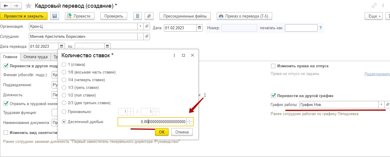 Затем Кадровым перемещением устанавливаете сотруднику новый график.