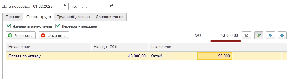 Создадим кадровое перемещение, указываем созданный график работы и изменяем кол-во ставок (если не активны ставки, необходимо в Настройке — Кадровый учет поставить v Используется работа по неполной ставке)