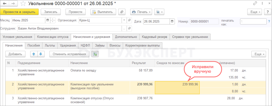 Ошибка в ЗУП 3.1 — неправильно считаются взносы, если сумму выходного пособия поправили вручную
