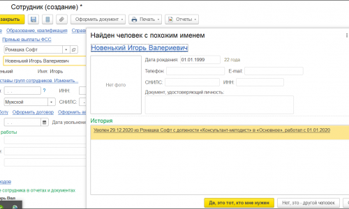 попробуйте после тестово принять- напишет программа при создании сотрудника,что «найден» ?