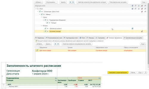 Чтобы «добрать» до параметров шифта Занята, можно встать на уровень Колонки — Состоянии позиции. Поставить флажок Текущий элемент имеет собственные настройки. Добавим оформление. Я для наглядности выбрала красный цвет. Чтобы настройка применилась, нужно указать Оформляемые поля — Состояние позиции. Область применения — в группировке. Прикладываю скриншот.
