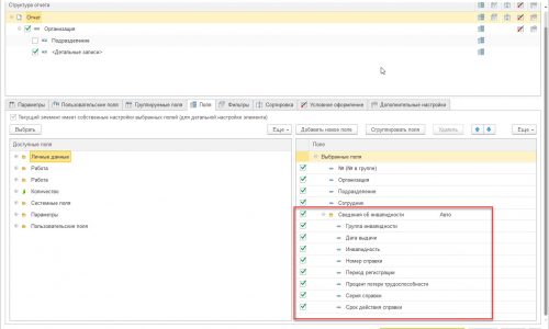 В настройках отчета убираем лишние поля и добавляем информацию об инвалидности.Прикладываю скриншоты — посмотрите, пожалуйста 🙂