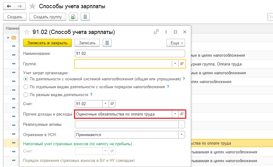 Если способ отражения с 91 счетом не был создан ранее, то для резервов в поле Прочие доходы и расходы укажите предопределенный Оценочные обязательства по оплате труда: