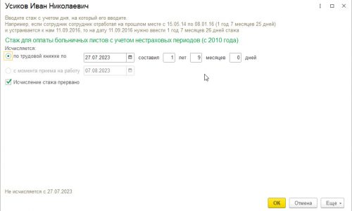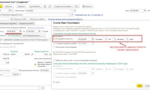 Далее я создала больничный лист с 1 августа — стаж перестал считаться и остался на рассчитанным на прежнюю дату. Скриншоты прикладываю.
