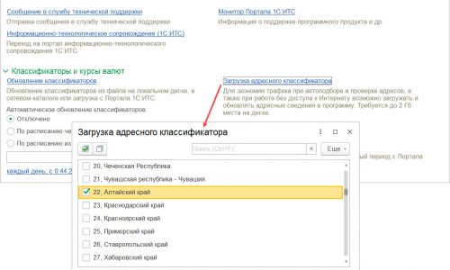 Если у вас включена интернет-поддержка пользователей, то нужно выбрать Автоматическое обновление классификаторов — По расписанию через интернет. Это расписание будет относиться ко всем классификаторам.