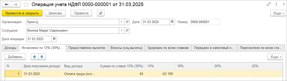 1. Воспользуемся документом Операция учета НДФЛ. Данный документ делает движения только в НУ. Поэтому создадим Операцию учета НДФЛ — дату получения дохода укажем 31.03.2025г. и уменьшим в НУ Исчисленный НДФЛ на 63150 руб., чтобы сравнять НДФЛ в НУ и БУ, например: