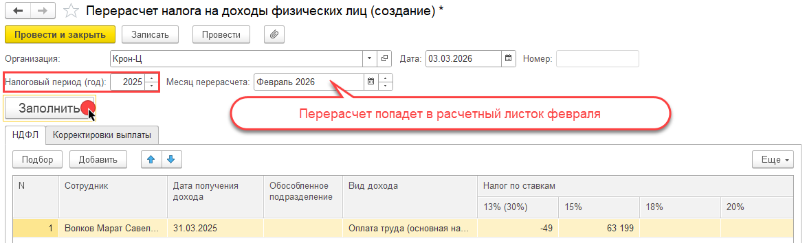 2. Теперь у нас исчисленный НДФЛ за 2025г. одинаково неправильный как в НУ, так и в БУ. Чтобы исправить исчисленный НДФЛ одновременно в НУ и БУ создадим документ перерасчет НДФЛ за 2025 год. И заполним — ожидаем, что автоматически подтянется сумма НДФЛ + 63150 руб. Теперь НДФЛ отразится правильно в НУ и БУ т.к. документ Перерасчет НДФЛ делает движения в регистрах НУ и БУ, например: