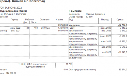 Здравствуйте, интересное решение — можно же не удалять удержание , которое внесли с марта, а поставить там дату окончания 31 мая. В июне прошло сторно премии-90000, соответственно отрицательный ндфл, сделала возврат НДФЛ и возврат долга на сумму сторно 90000, создала в июне новое удержание с пометкой ограничения взыскания, а сумму за минусом ранее удержанных с марта по май, ну и дальше по видео. Вопрос — на стороне зуп сделали технический возврат долга, на стороне БП его нет, а как же сальдо по 70 счету?