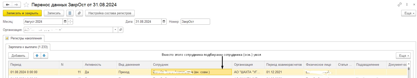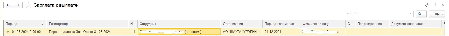 По Балаба открываем регистр Зарплата к выплате и ищем сотрудника с припиской (вн.совм), в переносе данных перевыбираем вместо нее основного сотрудника