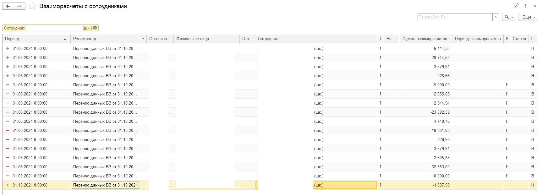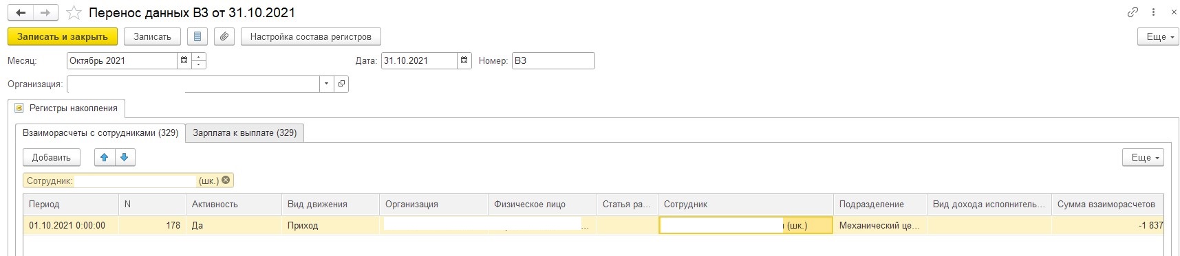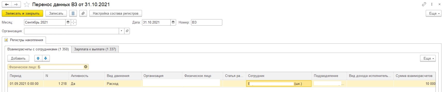 Откроем по очереди регистр, сделаем отбор по фио. Нам нужно проверить: если документ регистратор Перенос данных. Уточните, пожалуйста, а почему решили, что есть этот документ для сотрудника?