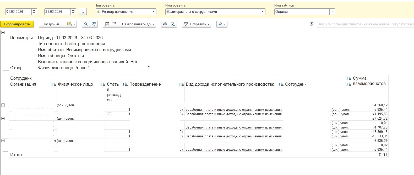 Сейчас можно не делать перенос данных, а попробовать разобраться именно со взаиморасчетам по физлицу. У физ лица есть есть еще одно внутренние место работы и основное. Правильно ли я понимаю, что на текущий день — по всем местам работы прошло увольнение.
