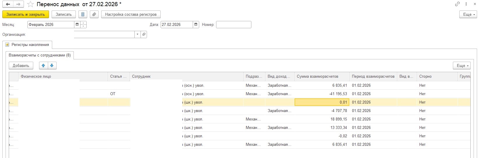 Развернула копию базы. Ведомость в банк 086 от 31.12.2021 года — в ней выбран сотрудник с табельным номером 1033. Если открыть и перевыбрать сотрудника, то больше не проявится. Исправить пересортица с помощью технической ведомости на получится, так как по физ.лицу сделано очень много документов Переноса. Чтобы привести в порядок взаиморасчеты, нужно проверять все документ Переноса данных. На мой взгляд, это не оправдано сложная и кропотливая работа. В такой сиутации я бы убрала все документы переноса данных и исправила все именно технической ведомость на дату увольнения.