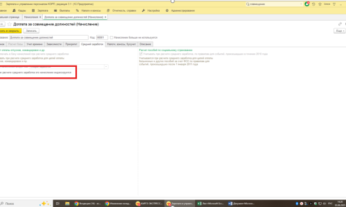 К сожалению, начисление «Доплата за совмещение должностей, исполнение обязанностей» настроено в программе так, что обычным способом изменить настройку среднего заработка не получится.