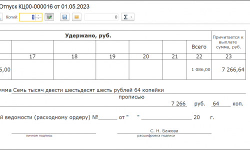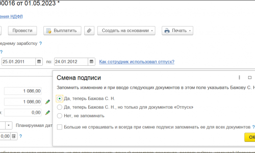 Вопрос несколько о другой ситуации. В настройках Учетной политики для организации уже установлено изменение подписи для организации. В документе отпуск уже указана подпись бухгалтера с 01.05.2023. А в печатной форме Записка расчет отсутствует Подпись бухгалтера.