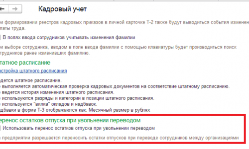 Не могу найти Настройка — Кадровый учет — Использовать перенос остатков отпуска при увольнении переводом.
