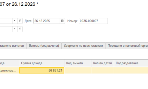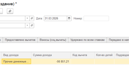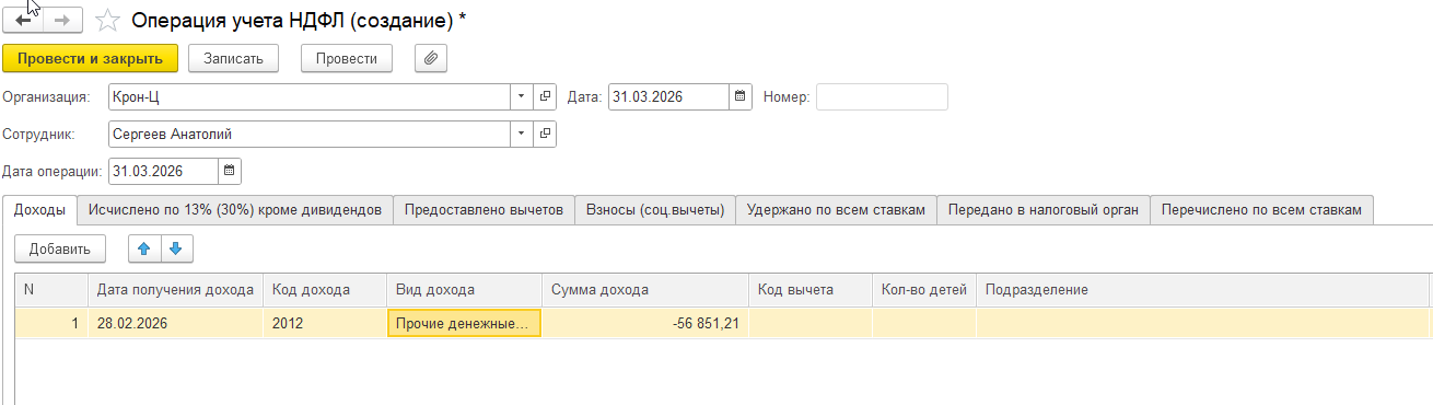 Начнем в первую очередь с 2026 года, чтобы в первую очередь заполнить отчет за 1 квартал. Сделаем документ Операция учета ндфл. Дата документа 31.03.2026. Дата операция 31.03.2026. Важно заполнить 2 вкладку, указав Подразделение. Прикладываю скриншоты с Вашими цифрами.