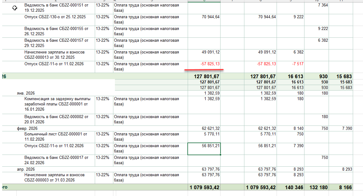 Получается нам нужно скорректировать учет текущего года и 2025 года. Так как у сотрудника прошло сторно отпускных, которые выплатили в 2025 году, то нужно будет подать корректировку годового отчета.