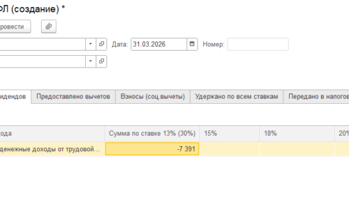 у бухгалтера он добирает 7391 в ведомости на выплату за март от 03.04.2026 Правильно ли я понимаю, что программа регистрирует удержанный ндфл? В отчете Подробный анализ ндфл этого не видно. Но если это так, предлагаю сначала поправить исчисленный доход, и проанализировать результат. Возможно придется изменить сумму НДФЛ в ведомости