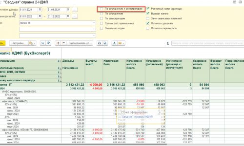 Если мы обратим внимание на шапку отчета, то там есть флажок По сотрудникам и регистраторам. Светлана на эфире в марте его установила, на эфире в апреле нет. Когда мы загружает отчет, то умолчанию данный флажок установлен.
