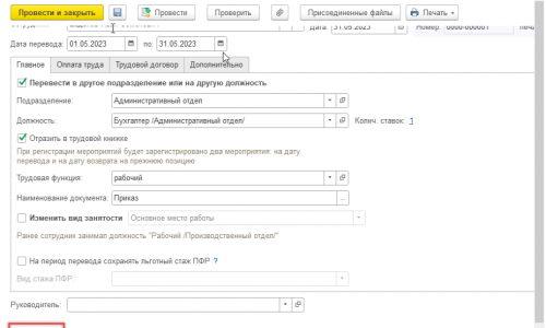 Для того, чтобы перевести сотрудника на другую должность постоянно, вам нужно в Кадровом переводе на временную должность указать дату окончания временного перевода днем раньше, чем дата с которой вы будете переводить сотрудника на постоянную должность.