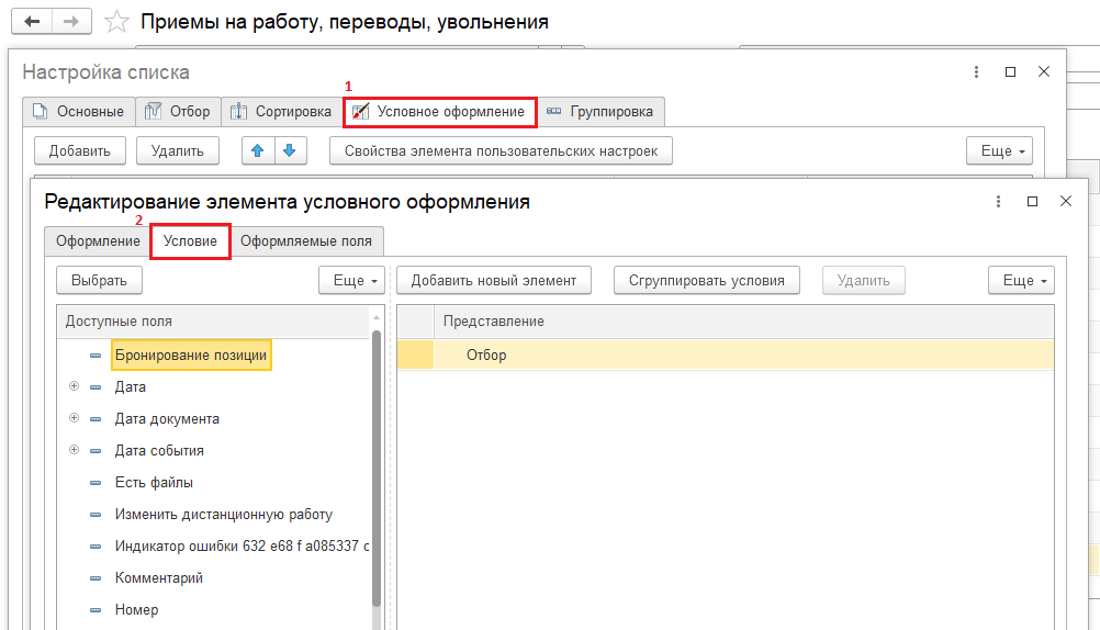 2. Проблема в том, что чтобы выделить строчку другим цветом, нам нужно указать условие, по которому это будет происходить. Если мы в журнале Приемы на работу, переводы, увольнения зайдем в меню справа Ещё — Настройка списка и перейдем на вкладку Условное оформление, то в Доступных полях мы не найдем подходящего поля:
