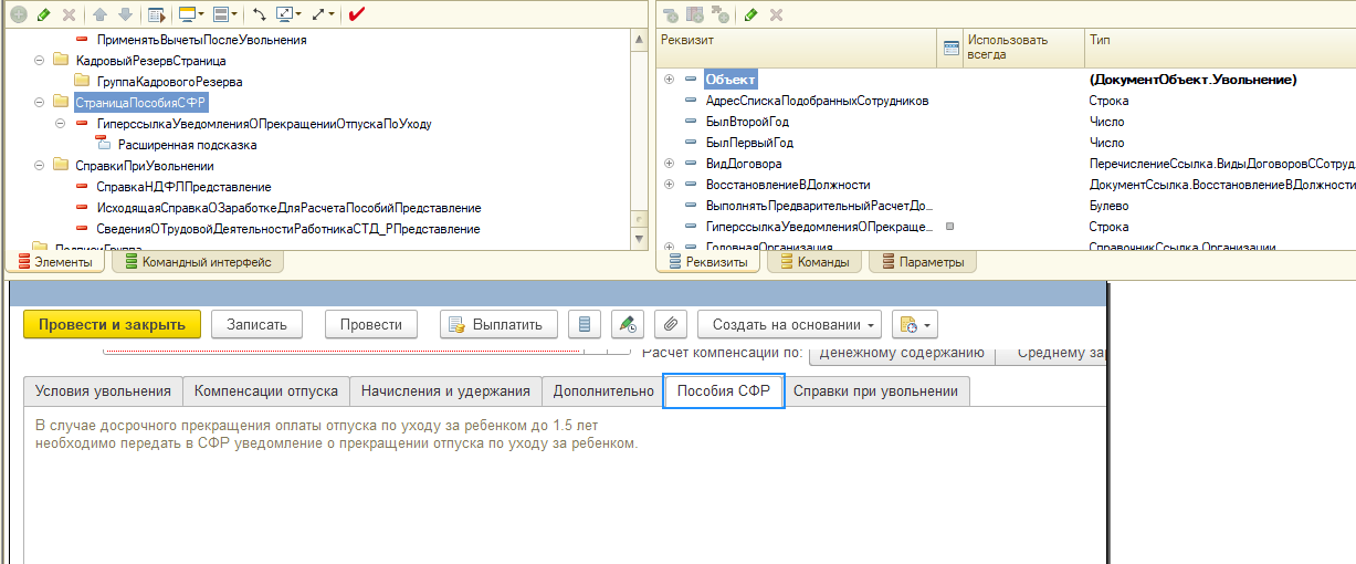4. Если посмотреть форму документа Увольнение в Конфигураторе, то там будет только вкладка Пособия СФР: