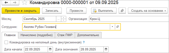 1. Документ командировка на сотрудника, чтобы был виден период командировки