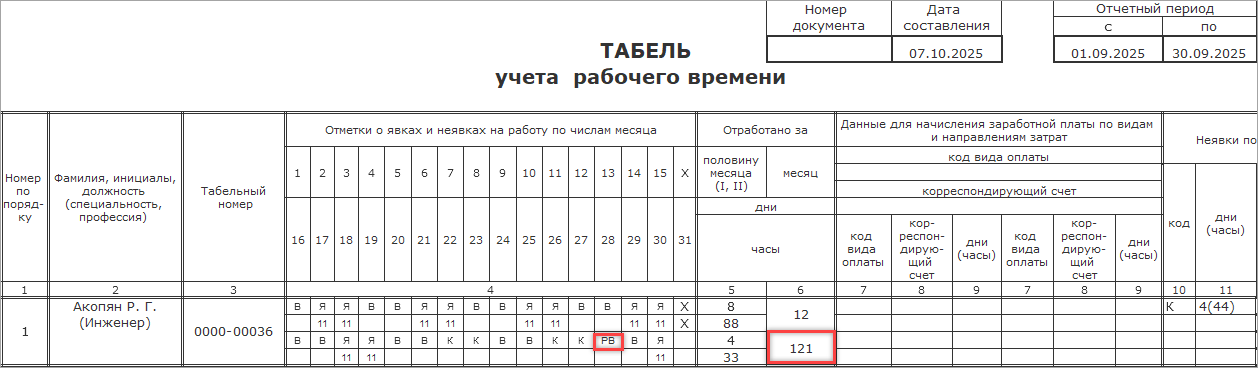 2. 28 сентября сотрудник работал выходные в командировке. Всего отработано за сентябрь 121 час.