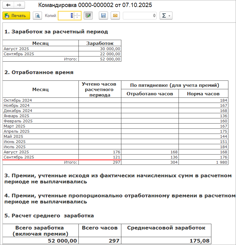 Смоделировала в демо-базе ЗУП 3.1.35.48 расчет оплаты командировки по среднему сотруднику при суммированном учете, если в расчетном периоде есть работа в выходные в командировке.