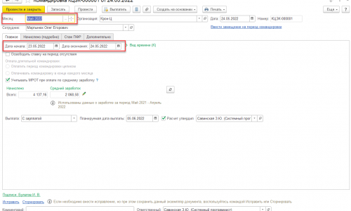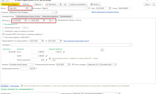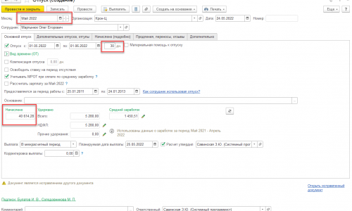 Второй случай: если отпуск был создан в апреле, а командировка в мае. Тогда Документ Командировка отсторнирует суммы оплаты отпуска. Начислит командировку. Затем Вы открываете документ отпуска, нажимаете «Исправить» (все как в первый раз), исправленный документ будет уже создан в мае. Программа сама предложит даты окончания отпуска. Если нет (не на всех релизах это работает), то откорректируйте. Отсторнируется не вся сумма отпуска, так как часть уже «забрала» командировка. Так что здесь все в порядке. Скриншоты прикладываю.