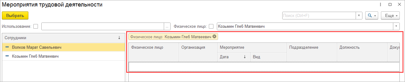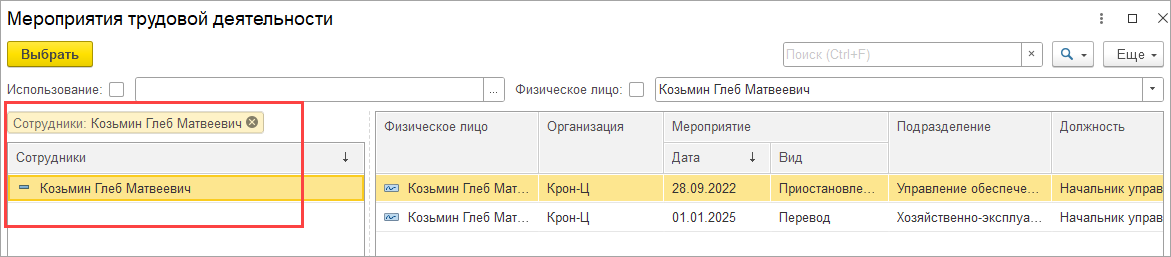 — Мероприятия трудовой деятельности переданные. Открыть регистр можно по ссылке: