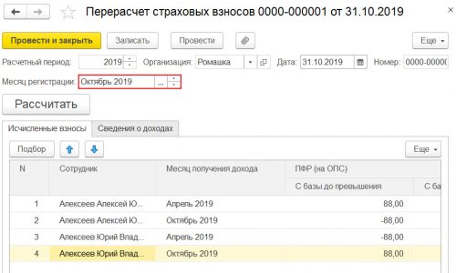 Что касается анализа взносов, то внутри, в расшифровке по начислениям выглядит немного криво из-за ручных операций, но в целом доход и база формируются ожидаемо. Да, апрельские взносы 88 руб видны, потому что месяц мы в документе Перерасчет страховых взносов указали октябрь. Но в этом документе, к сожалению, мы не можем указать апрель, иначе доначисленные взносы не попадут в отражение зп за октябрь и не будут отражены в проводках.
