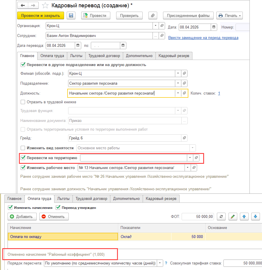 В этом случае также можем использовать документ Кадровый перевод, в котором нужно будет отразить изменение территории, должности и подразделения, например: