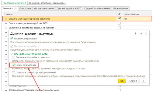 Кстати если поменять значение реквизита «Входит в учет общего среднего заработка» в режиме разработчика, то в консоли запросов видно, что он меняется, а при открытии начисления и расчете зп все равно ведет себя неправильно. Предполагаю, что где-то в коде стоит дополнительно проверка по остальным настройкам и при назначении начисления «Повременная оплата труда и надбавки» для начисление за отработанное время действительно смена настроек сз не срабатывает.