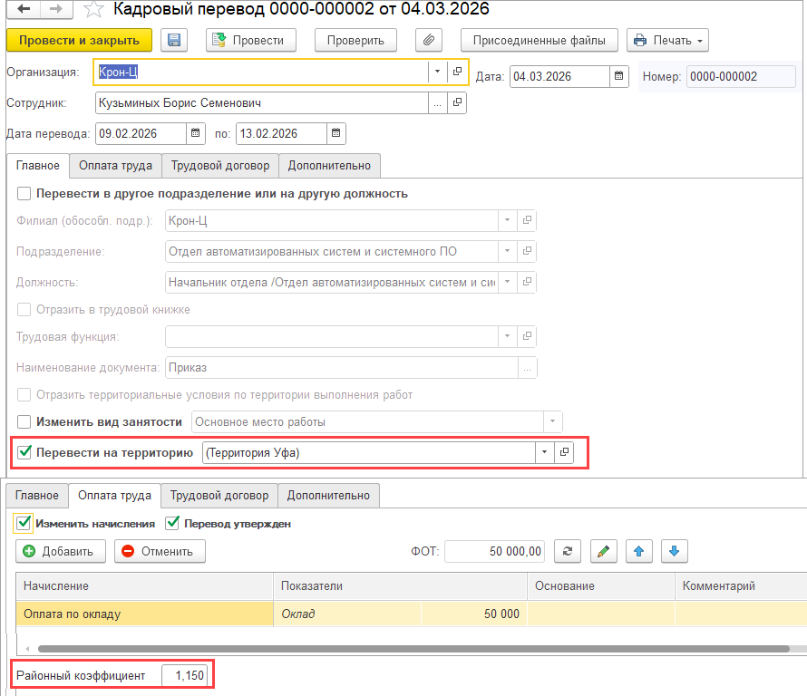— если сотруднику уже назначен РК по основному месту работы, то достаточно в табеле указать территорию с другим размером РК — это позволит рассчитывать РК в разном размере до перевода и после перевода на территорию.