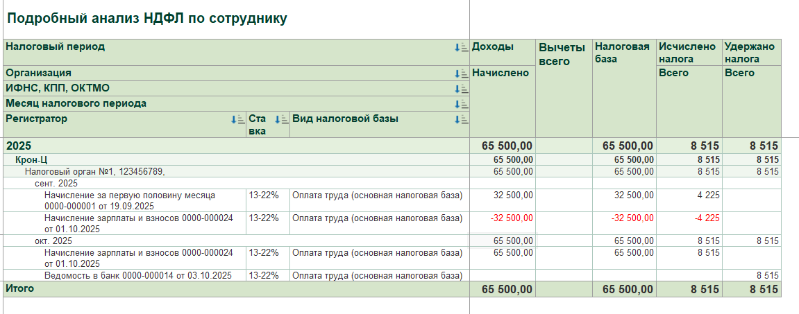 — подробный анализ НДФЛ по сотруднику с января по октябрь — проверим НДФЛ на текущий момент