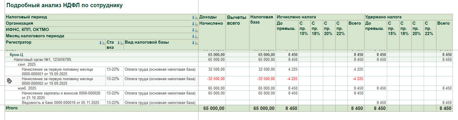 — подробный анализ НДФЛ по сотруднику с января по сентябрь — проверим итоги на отчетную дату