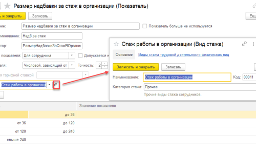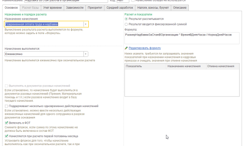 Создаем показатель Размер надбавки за стаж в организации (Настройка-Показатели расчета зарплаты). Требуется выбрать вид стажа, который будет влиять на размер показателя и заполнить шкалу стажа. Для этого, создаем вид стажа Стаж работы в организации (Настройки-Предприятие-Виды стажа), категория стажа – Прочее. Следует создать начисление, которое является плановым и в настройках указать, что оно выполняется Ежемесячно. Далее заполнить стаж через карточку Сотрудники всем сотрудникам. Для назначения надбавки в плановом порядке можно воспользоваться документом Изменение плановых начислений или Назначение планового начисления.