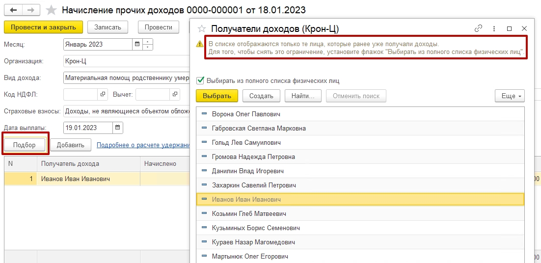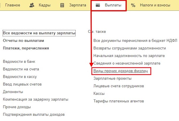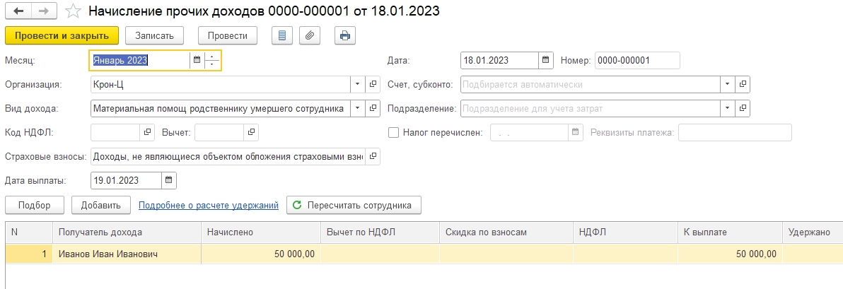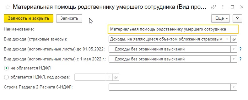Далее создаем новый вид прочих доходов — Материальная помощь родственнику умершего сотрудника (код дохода 2710)