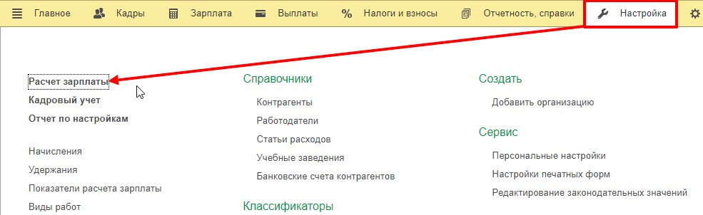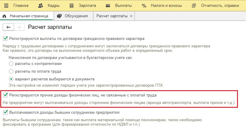 Для того, чтобы произвести начисления, соответствующие материальной помощи родственнику умершего сотрудника, не являющемся сотрудником организации, нужно проверить, активна ли функциональная опция в разделе «Настройки» — «Расчет зарплаты»