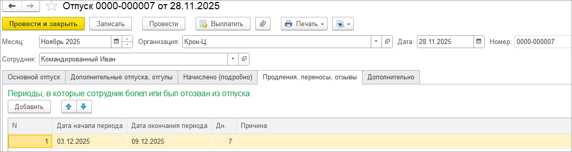 Если сотрудник сразу догуливает дни, на которые был отозван, то можно отразить отзыв и продление в документе-исправлении Отпуск — это разбирается в Варианте 1 из статьи.