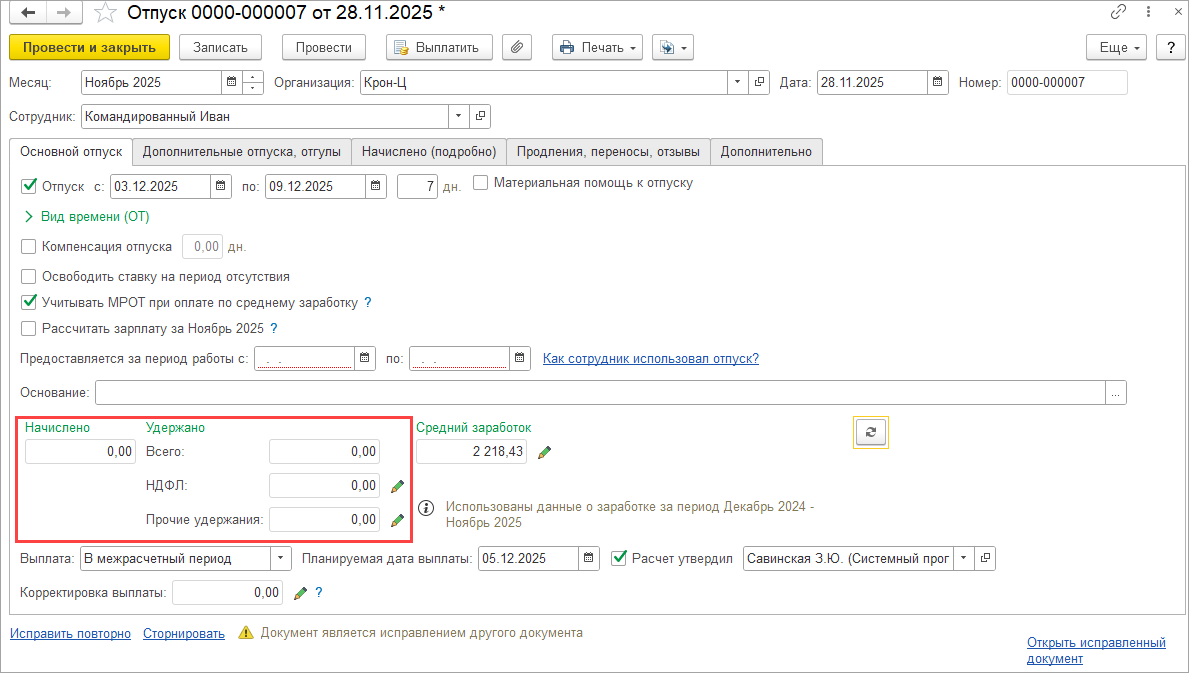 В результате в документе-исправлении Отпуск суммы обнуляются — нет дохода и нет НДФЛ — данные документа-исправления заменяют собой начисленные в первоначальном документе Отпуск суммы.