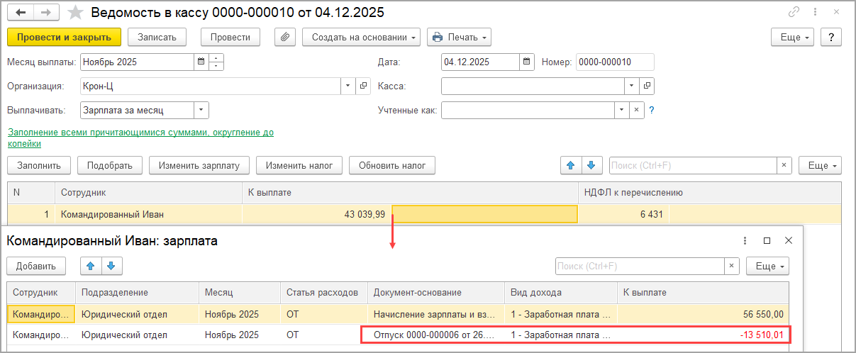 После начисления зарплаты за ноябрь формируем ведомость на выплату в которой проверяем, что уменьшилась сумма к выплате и НДФЛ — с учетом отмененного отпуска, по нему появляются суммы с минусом: