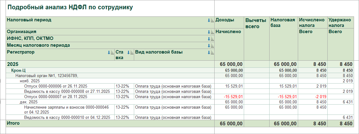 После формирования ведомости на выплату з/п, можем сформировать Подробный анализ НДФЛ в котором видим, что сумма отпускных и исчисленный НДФЛ с нее сторнируется, а при выплате зарплаты уменьшается удержанный НДФЛ :